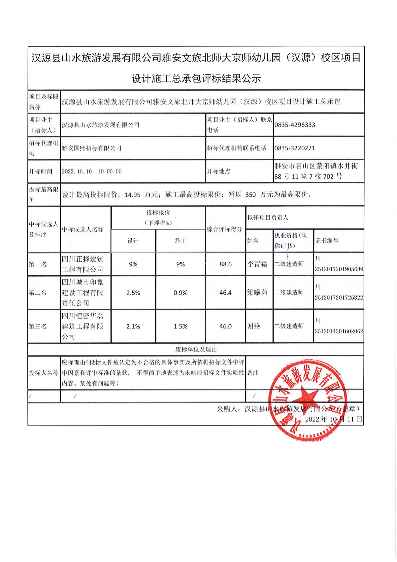 漢源縣山水旅游發(fā)展有限公司雅安文旅北師大京師幼兒園(漢源)校區(qū)項(xiàng)目設(shè)計(jì)施工總承包評標(biāo)結(jié)果公示